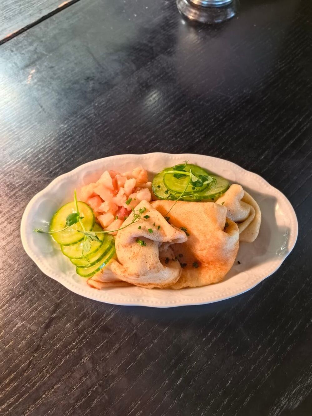 Нежные блины, приготовленные на молоке, дополнены пикантным тартаром из копчёного палтуса. Слайсы малосольного огурца придают свежесть и лёгкую солоноватость. Сочетание сливочной текстуры блинов и насыщенного вкуса рыбы создаёт гармоничный ансамбль
