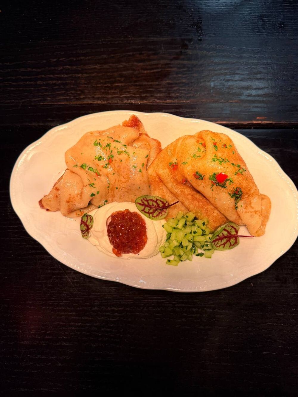 Нежные блины, приготовленные на молоке. Домашняя сметана придаёт сливочность, икра нерки — изысканность. Тартар из свежего огурца добавляет лёгкую хрустящую текстуру и свежесть