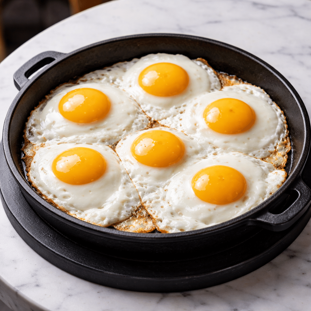 Сытная глазунья из шести яиц. Соль раскрывает натуральный вкус белка и желтка, перец придаёт лёгкую пикантность. Аппетитная текстура и простой, но выразительный вкус