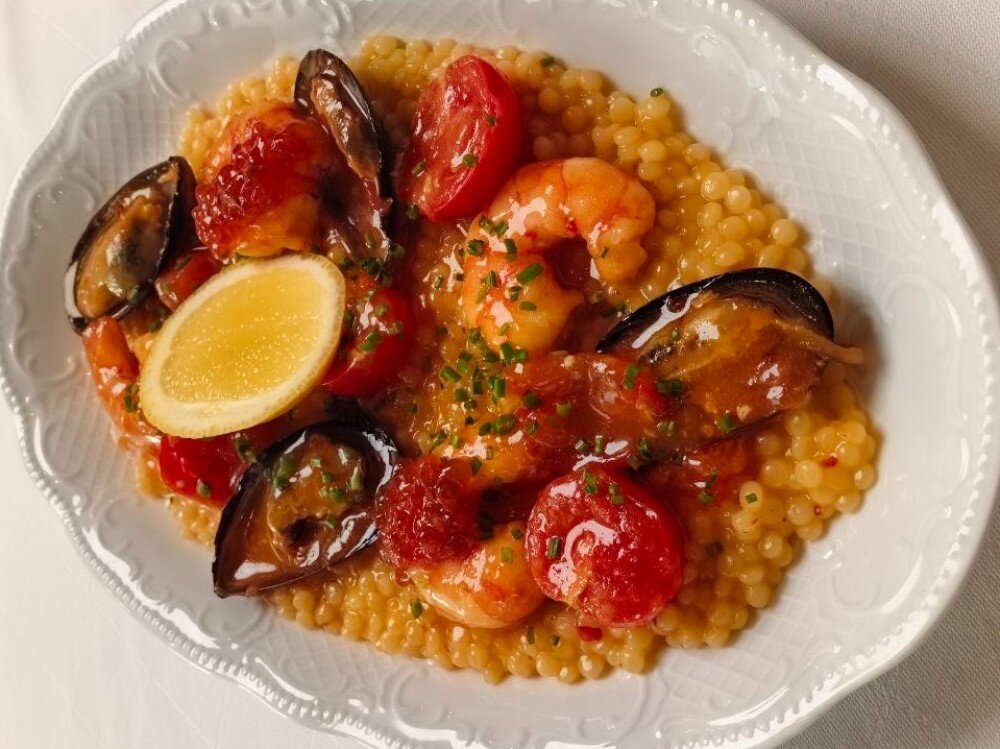 Паста птитим с морепродуктами. Креветки и мидии в сочетании с соусом чили и кетчупом создают насыщенный вкус. Томаты черри и красная икра добавляют сочность и изысканность.