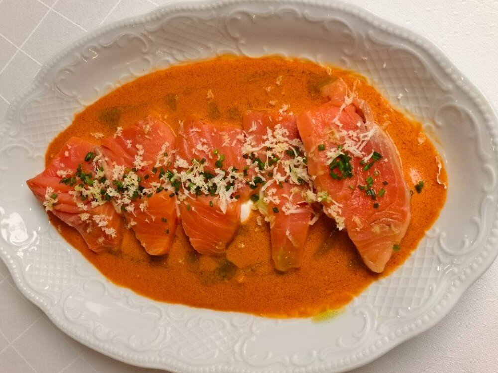 Свежая рыба в пикантном соусе. Лосось и форель с соусом том ям создают яркое вкусовое сочетание. Мусс крем-чиз и корень хрена добавляют нежности и остроты