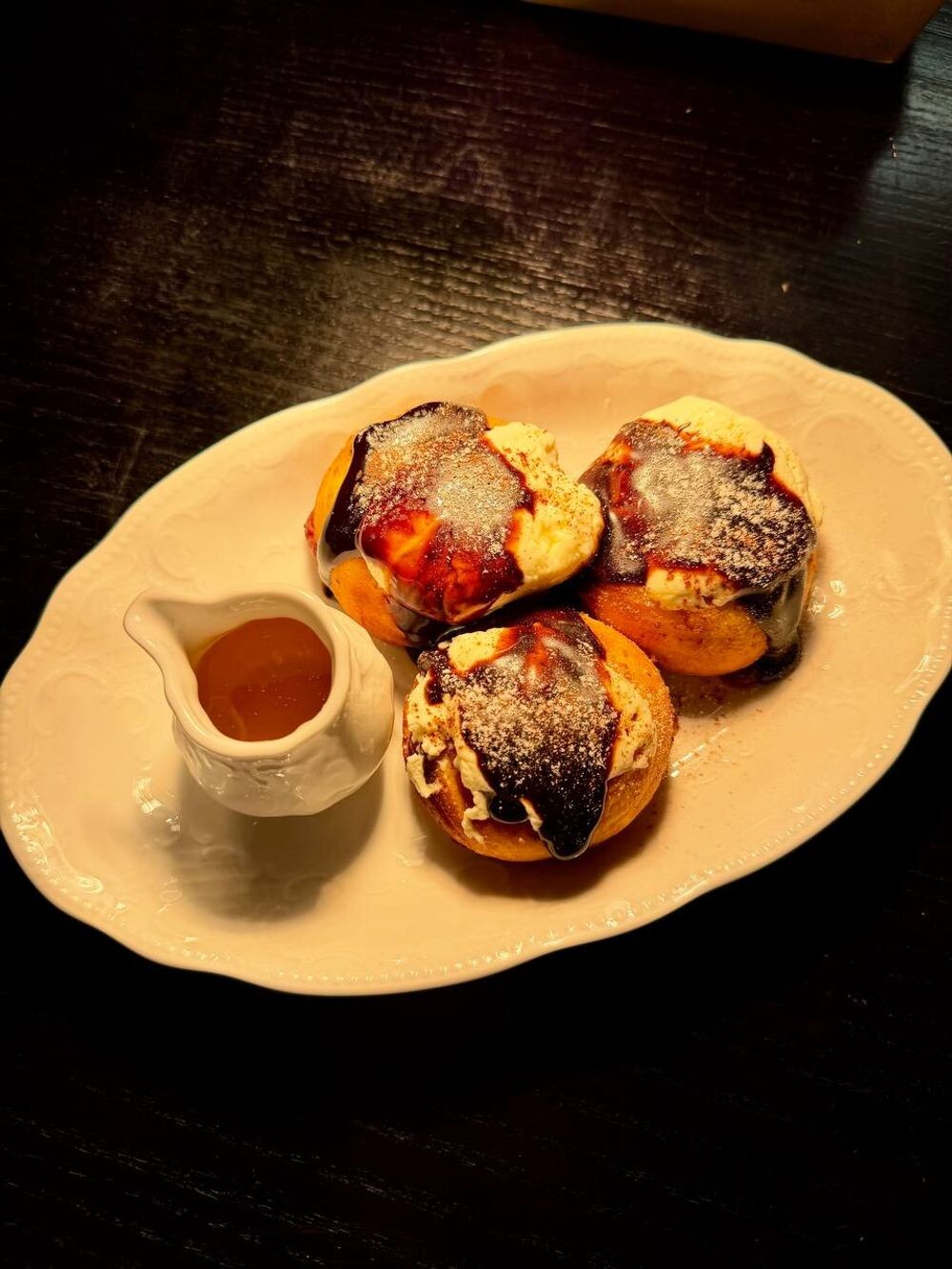 Нежные сырники из творога с приятной текстурой. Домашняя сметана смягчает вкус, клубничный джем добавляет сладкую кислинку. Топлёный шоколад и мёд придают изысканность