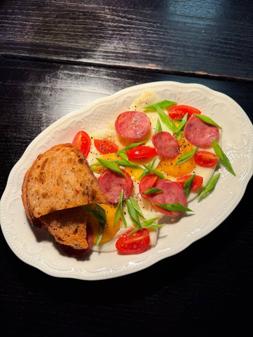 Аппетитная глазунья с сочными томатами черри и пикантной салями. Зелёный лук придаёт свежесть, французский хлеб отлично дополняет блюдо. Сочетание яичной нежности и мясных нот создаёт гармоничный вкус