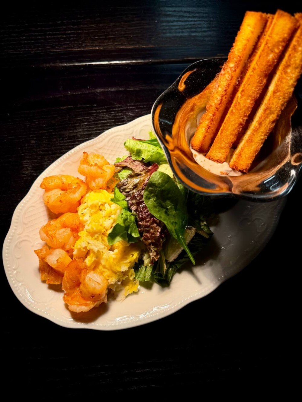 Сытный французский завтрак на воздушной бриоши. Яйца и шпинат создают нежную основу, руккола добавляет лёгкую горчинку. Креветки и мусс из тунца придают изысканность и морскую свежесть